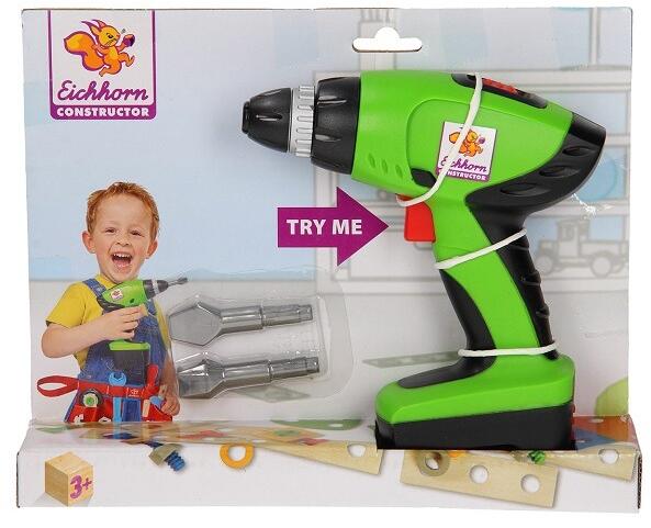 A kézi szerszám elem nélkül, mechanikusan működik, gombnyomásra. A gyerekek kezéhez igazított szerszám, melynek működése az igazihoz hasonló. A mellékelt 1 fúrószár és 2 csavarhúzófej valamelyike felhelyezése után, gomb megnyomásával lehet a gépet meghajtani. A valódi szerszámot imitáló játékfúrógép.