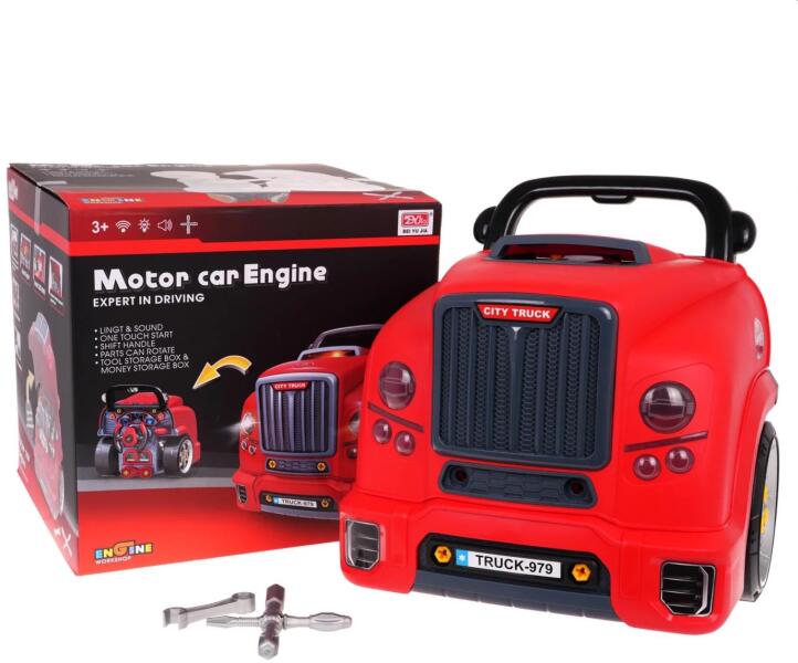 Interaktív játék, a jármű elülső része emelhető motorháztetővel és műszerfallal 3 éves kortól gyermekek számára készült. A készlet tartalmazza a jármű elejének összeszereléséhez szükséges alkatrészeket és az alkatrészek össze- és szétszereléséhez szükséges szerszámokat, például csavarhúzót vagy villáskulcsokat. A jármű motorházteteje alatt egy nagy szétszerelt motor található, amelyet egy gyerek is szétszedhet. A gyújtógyertyák és a kerekek is cserélhetők. A műszerfalon van egy járműindító gomb motorindító hangokkal, egy mozgatható kormánykerék dudával és egy vészjelzés. A kormány alatt található egy tárolórekesz, amibe minden szükséges szerszámot, csavart és gombot el lehet helyezni. A játék kényelmes fogantyúval rendelkezik a hordozáshoz. A kis szerelőnek szánt játék fejleszti a kézügyességet, a finommotorikát és a szem-kéz koordinációt. A termék jellemzői:- megemelt motorháztető- bontott motor- a motor beindításának, vezetésnek, hátramenetnek a hangja- kürt a kormányon- vészjelzés- világító fényszórók- motor világítás- szerszámtároló- váltókar- mozgatható kormánykerék- kényelmes hordozó fogantyú