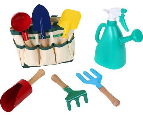Könnyen hordozható, zsebekkel és fülekkel ellátott vászontáska, amiben praktikusan tárolhatóak a kerti szerszámok. A kis kertész tapasztalatokat szerez a természetben és örömteli időt tölt saját kiskertjében. A szett 8 részes: 6 darab színes kertészeti szerszám, 1 locsolókanna és egy hordozó táska. A szerszámok nyele fából készült, a feje fémből.